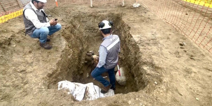 Peruvian gas workers found a thousand-year-old mummy while installing pipes in Lima, earlier this week. Their company confirming the latest discovery of a pre-Hispanic tomb in the capital. Ceramic objects, including plates, bottles and jugs decorated with geometric figures and figures of fishermen, were also found next to the mummy.