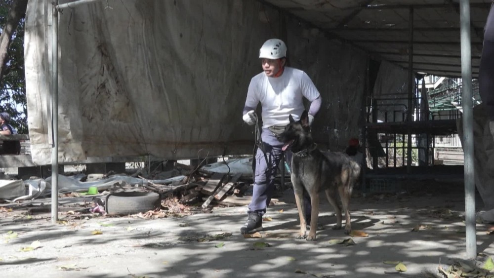 And I hope that if the time comes, then I can be a part of that and help do that." Every Sunday, 46 mutts and pure-breeds of all sizes are put through their paces by volunteer trainers at a facility in suburban Manila where they learn to track down survivors, scale ladders and bound over wooden structures.