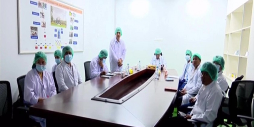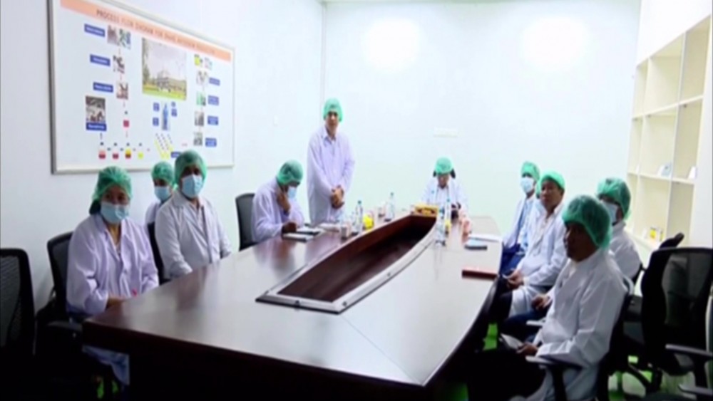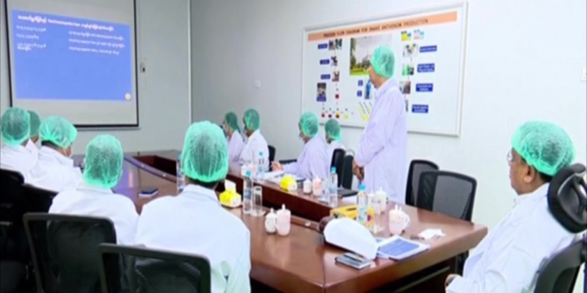 Union Minister for Industry Dr. Charlie Than arrived at the meeting hall of Snake Antidote Production Department of Pharmaceutical Factory in (Insein). After hearing the reports on the implementation for the production of freeze Snake Antidote, installation of new equipment for boosting production, Union Minister instructed to carry out the installation process of freeze dryer according with the rules and regulations for more production of Snake Anti-venom. And he also added to keep production of basic medicines for the people, to purchase raw materials for medicine supplies and spare mechanical equipments. And he inspected the step by step production of Snake Anti-venom.