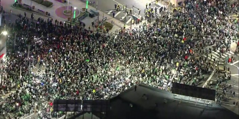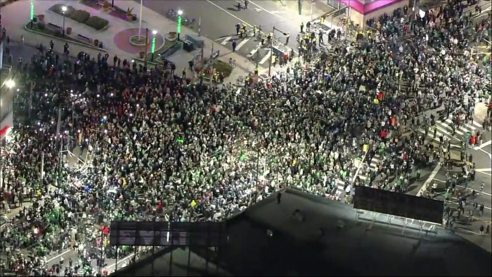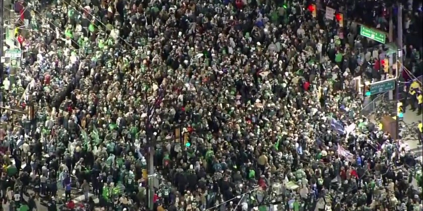Huge crowds could be seen celebrating in Philadelphia on Sunday night after the NFL Philadelphia Eagles defeated the San Francisco 49ers 31-7 in the NFC championship game. The win sends the Eagles to the Super Bowl. They will face the Kansas City Chiefs, who defeated the Cincinnati Bengals 23-20 in the AFC championship game in Kansas City. The Super Bowl will be played on February 12 in Glendale, Arizona.