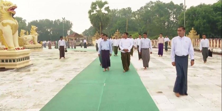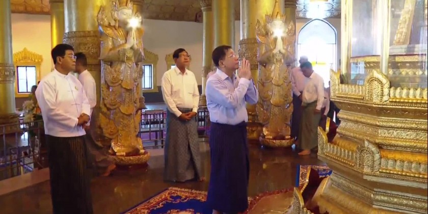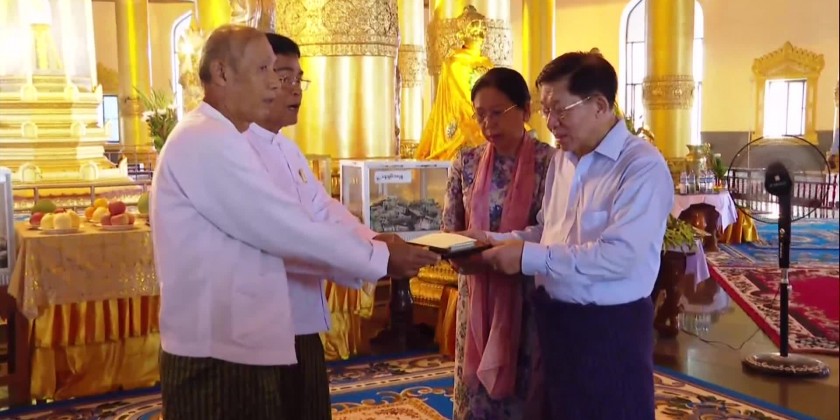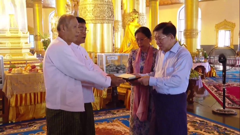 At the pagoda, the Prime Minister and wife offered flower, water, oil light and fruit to the pagoda. During the visit, the Prime Minister and his wife presented cash donated by the family of Tatmadaw (Army, Navy and Air) and well-wishers for all round renovation of the pagoda.
