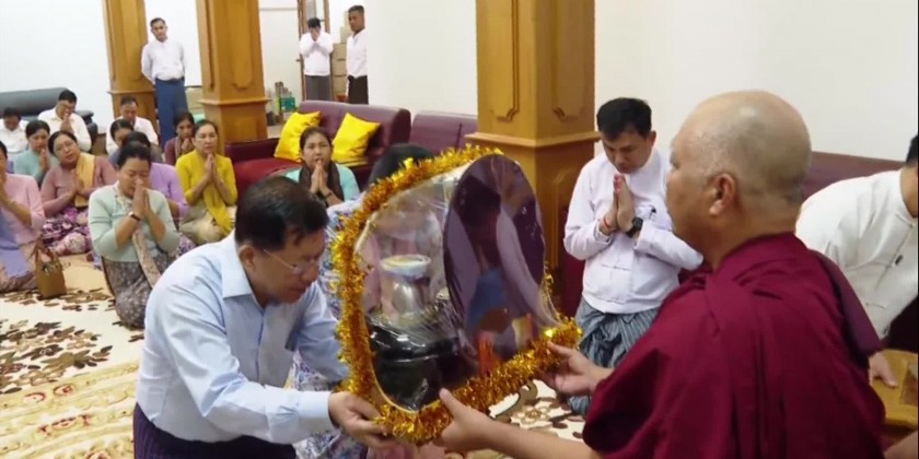 The Prime Minister and his wife and party later proceeded to the International Theravara Buddhist Missionary University and paid respect to the Rector Sayadaw. After submitting the religious and education matters, they received the sermon of Sayadaw, donating offertories and cash.