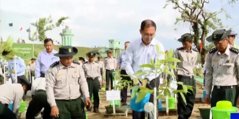 Member of the National Disaster Management Committee Union Minister for Natural Resources and Environmental Conservation U Khin Maung Yi, accompanied by Rakhine State Chief Minister U Htein Lin, joined the 2023 monsoon tree-planting ceremony at Kandawgyi Lake in Sittway on Monday.