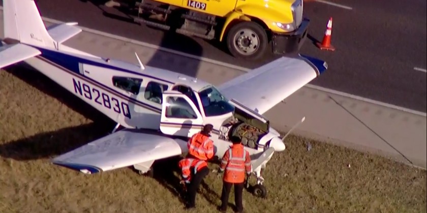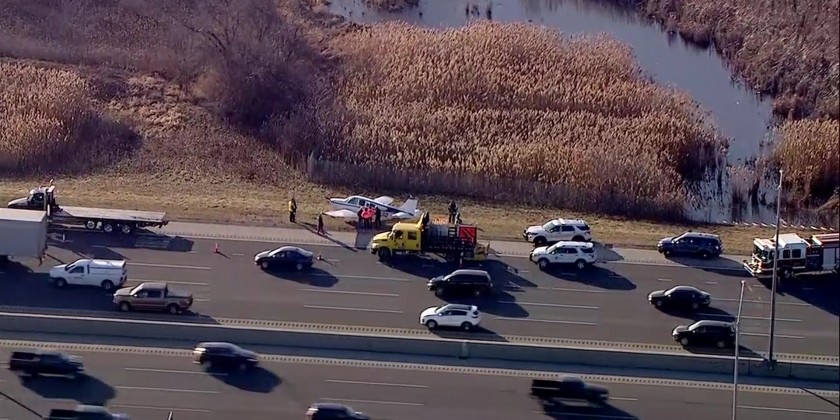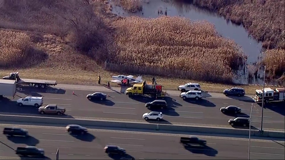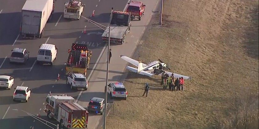 A small plane made an emergency landing Tuesday alongside a stretch of busy highway southwest of Chicago. The plane landed upright just off the shoulder of the southbound lanes of Interstate 355 in Bolingbrook, about 30 miles from downtown Chicago. The pilot was the only person on board and wasn't hurt.
