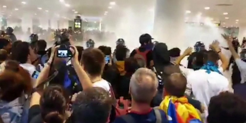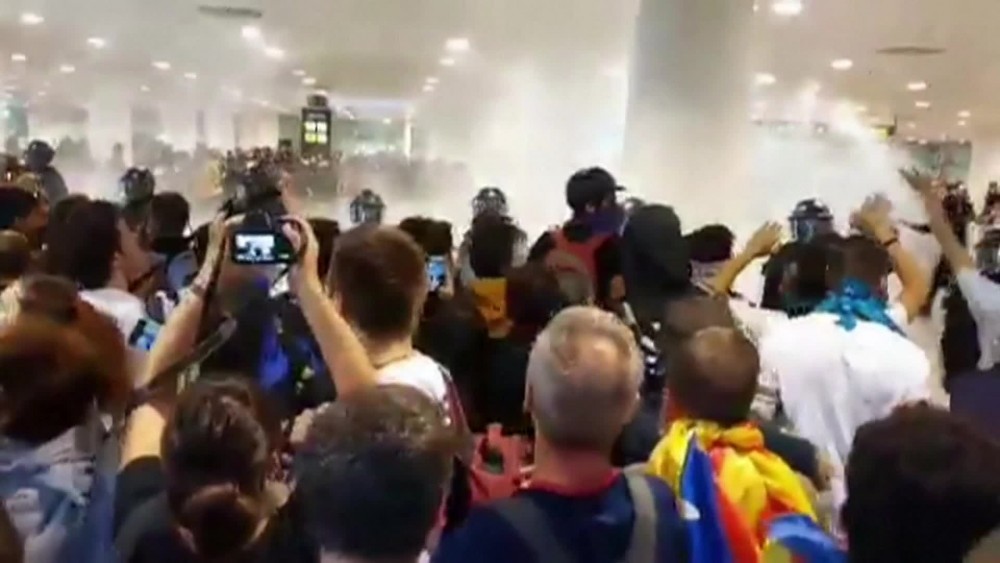 Spanish police charged against Catalan pro-independence protesters at the entrance to Barcelona's El Prat airport on Monday after Spain's Supreme court jailed nine separatist leaders, El Mundo newspaper said. Footage showed police using batons on some of the demonstrators, some of them masked and hooded, who pushed and shoved in return. There were some detentions. Thousands of people were gathered outside and dozens were in one of the access halls to the airport. The airport authority said at least 20 flights had been cancelled due to the protests.