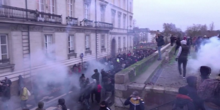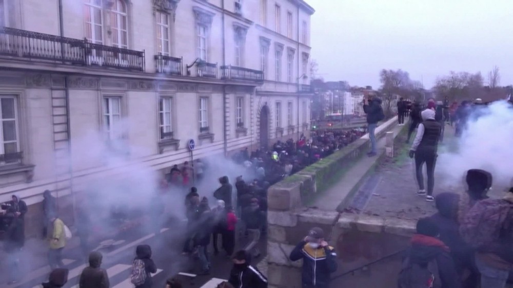 Thousands took to the streets in western French city of Nantes on Tuesday during a second round of nationwide protests against the government's proposed pension reform plan. The Nantes march saw some minor scuffles as police deployed tear gas on some disorderly demonstrators. Organizers had wanted to match the 800,000 who participated in a first day of protest last Thursday. But the union leaders acknowledged the crowds were smaller.