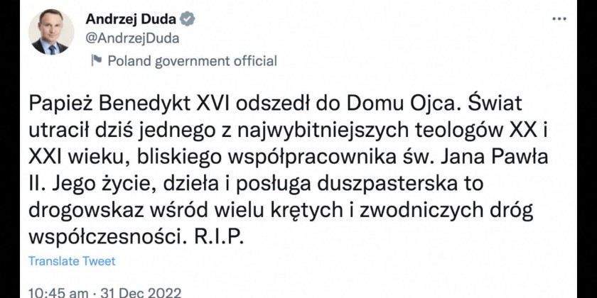 Pope Francis on Saturday praised Pope Emeritus Benedict XVI, who died at the age of 95 earlier in the day. Speaking during a New Year's Eve vigil, Francis thanked his predecessor for "his testimony of faith and prayer, especially in these final years of retired life".Benedict will forever be remembered as the first pontiff in 600 years to resign from the job.