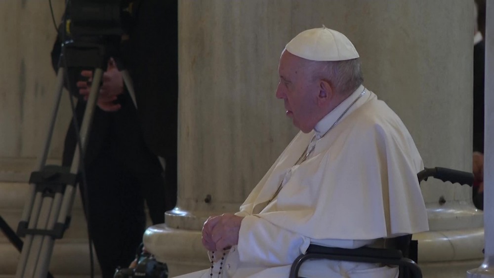Pope Francis prayed for the "gift of peace" on Tuesday as he led a rosary prayer at the Saint Mary Major Basilica.The Pope, who attended the mass in a wheelchair, read a prayer asking the Holy Mary to bring peace to the world.A Ukrainian family was among those that attended the service.The 85-year-old Argentine has been suffering from strained ligaments in his right knee for months, andrecently has been using a wheelchair. Francis will travel to Kazakhstan in September for an interfaith conference, a meeting that may give him a chance to meet with the head of the Russian Orthodox Church.