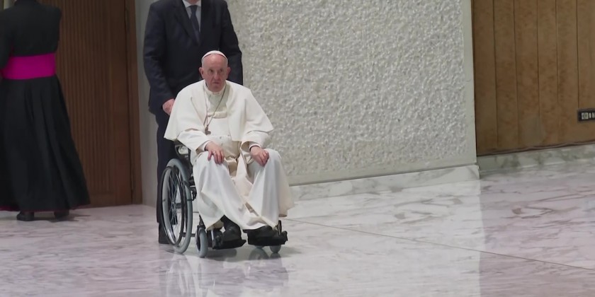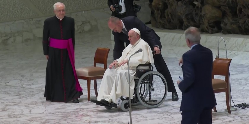 Pope Francis asked his congregation to pray for him on Friday after making another public appearance using a wheelchair. Francis is struggling to cope with strained ligaments in his right knee that have greatly limited his mobility.