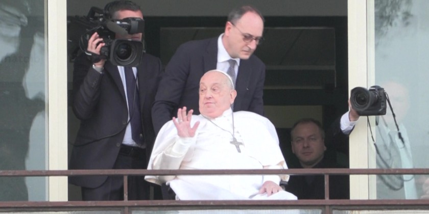 Pope Francis, 88, made his first public appearance since hospitalization by greeting and blessing the faithful from a balcony at Rome's Gemelli Hospital.