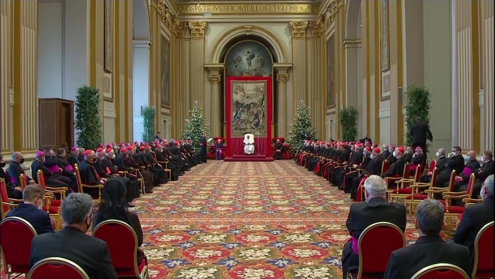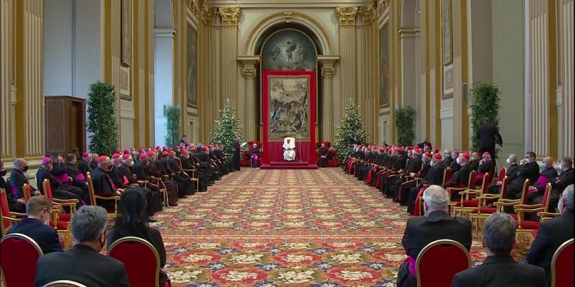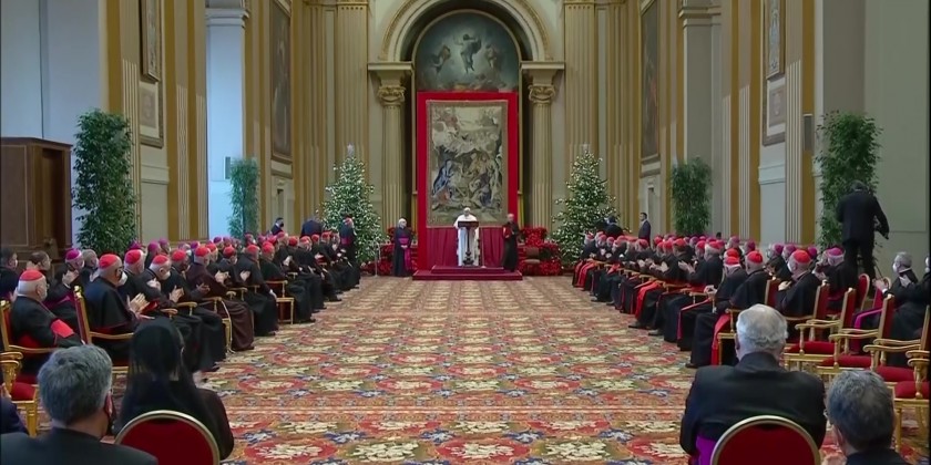 As they have in the past, cardinals and bishops sat stone-faced as they listened to Francis lecture them in the Hall of Blessings, which was otherwise decked out in jolly twinkling Christmas trees and poinsettias.
