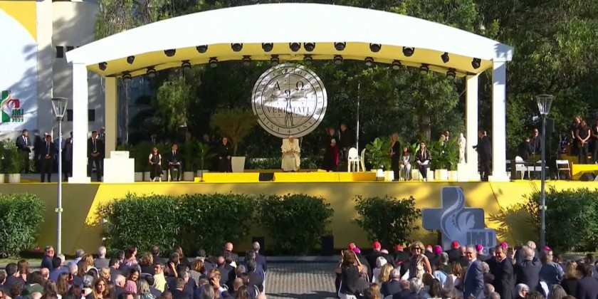 The audience of around 6,500 people, which included Portuguese President Marcelo Rebelo de Sousa and bishops, cheered and applauded as the pontiff took the stage. The first Latin American pope arrived in Lisbon on Wednesday for World Youth Day festivities.
