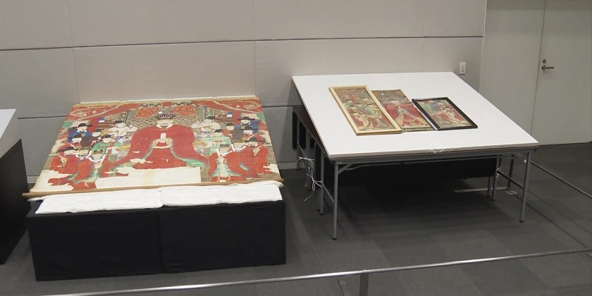 One, measuring about 180 centimeters square and the other portrait is split into three parts with one segment measuring 109 centimeters in length.The prefecture plans to establish a panel of experts this month to conduct a detailed analysis of pigments and other materials and to discuss how to proceed with the restoration of the paintings.
