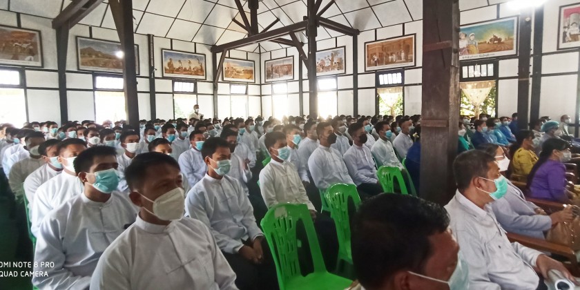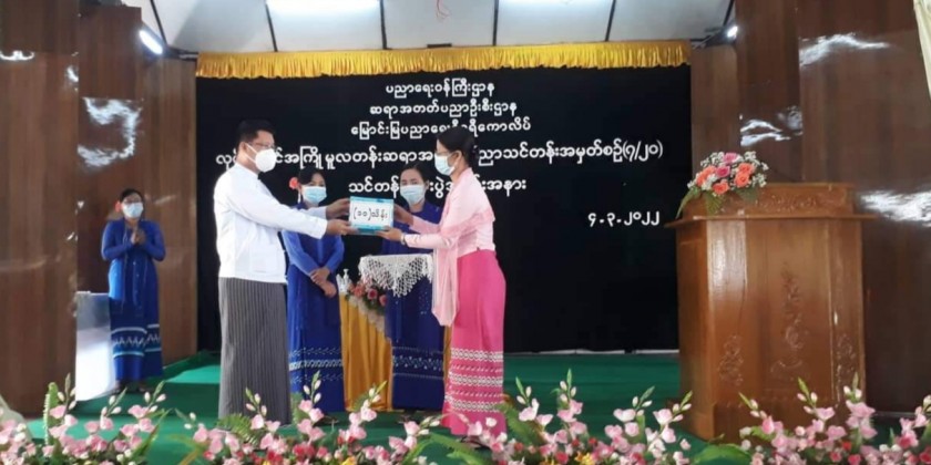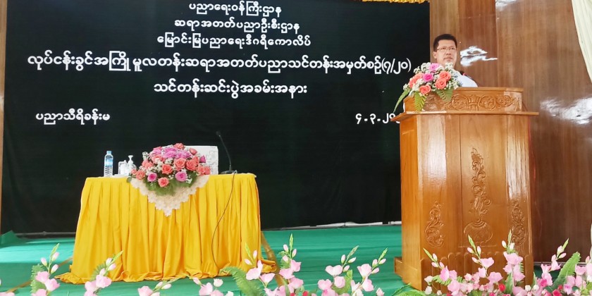 First, the threes of teachers took the 6 oaths of teachers and then, the Chief Minister U Tin Maung Win gave a speech on the completion of the training. Then, the Chief Minister handed over certificate of completing Pre-service Primary Teacher Training as per the townships and provided 1 million Kyats of cash assistance to the Myaung Mya Education Degree College and the deputy principal Daw Thuzar Shein accepted and the ceremony was concluded.