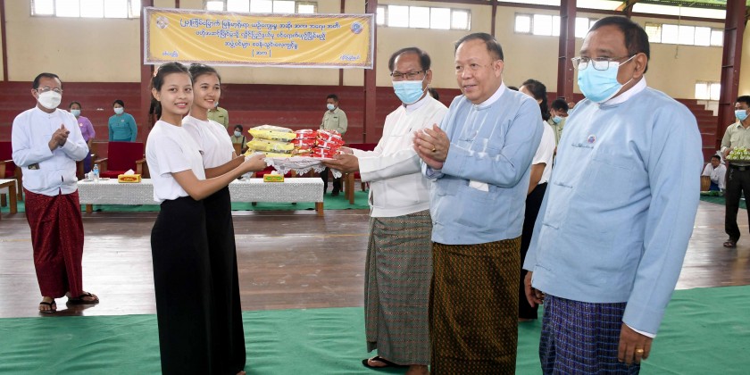 Then, the chief minister gave the words of encouragement and presented soft drinks and foodstuff for the trainees. A total of 66 trainees are being trained and practiced at the training camps in the Sittwe University to compete central level of 23rd Myanmar Traditional Cultural Performing Arts Competitions.