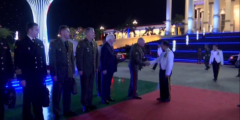 The State Administration Council Chairman Commander-in-Chief of Defence Services Senior General Min Aung Hlaing and wife Daw Kyu Kyu Hla cordially greeted the attendees to the pre-dinner in honour of the 79th Anniversary of Armed Forces Day including Deputy Minister for Defense of Russian Federation Colonel General Alexander Vasilyevich Fomin and his delegation members, SAC Vice-Chairman Deputy Commander-in-Chief of Defence Services Commander-in-Chief (Army) Vice-Senior General Soe Win and wife Daw Than Than Nwe, Chief of the General Staff (Army, Navy and Air) General Maung Maung Aye and wife, Commander-in-Chief (Navy) Vice Admiral Zwe Win Myint and wife, Commander-in-Chief (Air) General Tun Aung and wife, the SAC Secretary and wife, the SAC Joint Secretary and wife, SAC members and wives, Union level officials and wives, dignitaries, representatives from various organizations and guests.