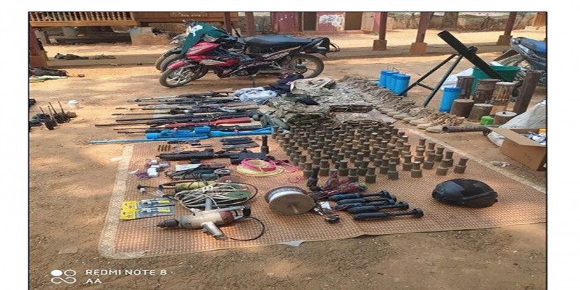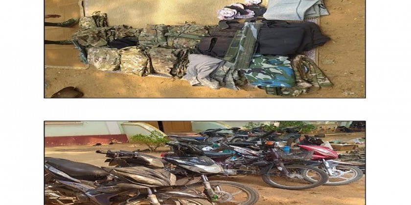 Following the formation given by the captured terrorists, the members of security forces conducted clearing area of near OakPho Village and in the village school in Sagaing Township sheltered by the members of Special Task Force-STF PDF and arrested PDF terrorist member Thawtar Tun was arrested with one FGC-9, 11 handmade guns, handmade launcher, 5 magazines, 115 rounds of various bullets, 81 grenades made in China, 28 homemade grenades, 15 improvised mines, 5 handmade drop bombs, materials and equipments of making weapons, one binoculars, a bullet proof vest, bullet proof cap, four walky-talky machines, 60 sets of guerrilla uniforms. 20 sets of guerrilla ankle boot, 20 boxes of various medicines, 9 motorcycles, 7 units of iron cutters and iron drill machines and one handcuff.