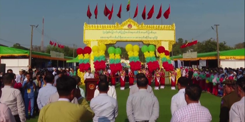 Following arrival, General Aung Lin Dwe and members attended the opening ceremony of exhibitions marking the 51st Mon State Day at the Thamein Baran (Multipurpose Ground) in Mawlamyine. The event featured commemorative displays, MSME local product exhibitions, and traditional food stalls.