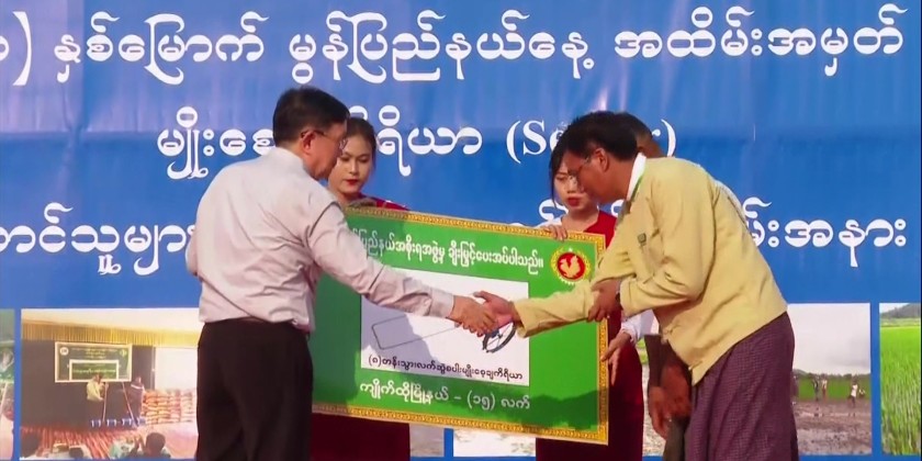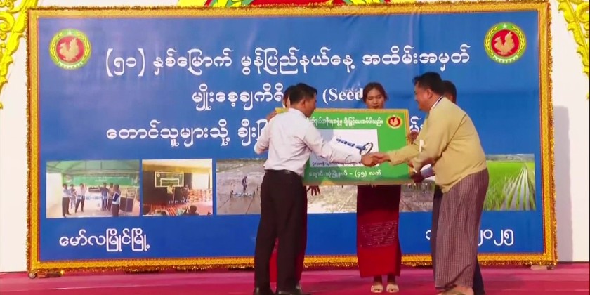 After that, General Aung Lin Dwe and members participated in a ceremony to present seed-sowing equipment to farmers from various townships in Mon State as part of the Mon State Day commemoration. They then proceeded to tour and support the exhibitions, MSME local product displays, and traditional ethnic food stalls, observing the showcased items and sales activities.