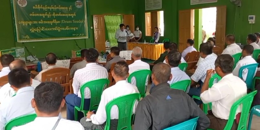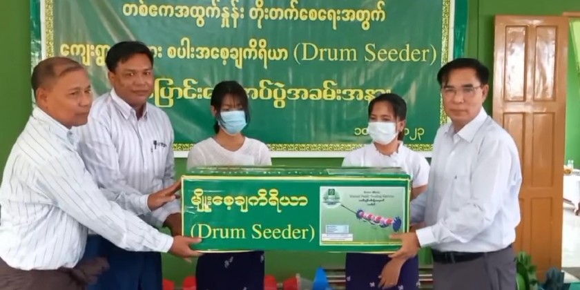 Next, Chief Minister and party attended the provision ceremony of drum seeders for the development of agricultural sector at the community-based agricultural observatory camp of Pha Yar Gyi Town, Bago Region. Then, they provided drum seeders to farmers and coordinated for the establishment of commercial farms from manageable scale with the cooperation of department of agriculture.