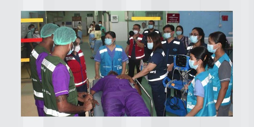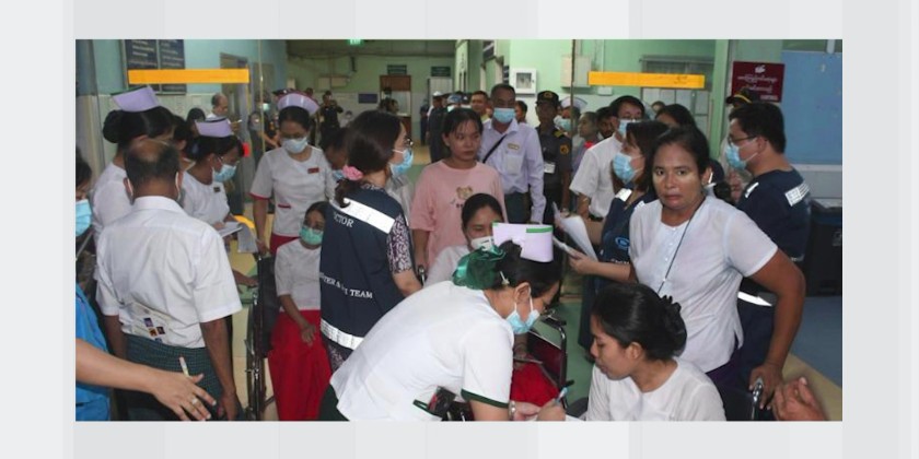 Yangon General Hospital conducted a large-scale emergency response drill, simulating a mass casualty incident caused by a natural disaster. The drill took place on May 23 with the participation of about 200 personnel from various sectors. The drill aimed to enhance preparedness and reduce the impact of potential natural disasters by ensuring timely medical response and coordination.