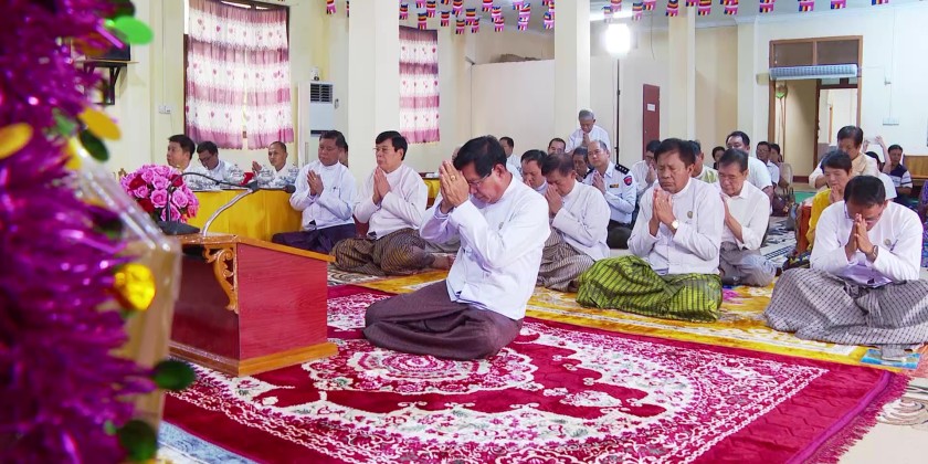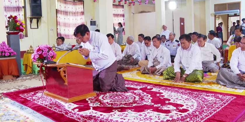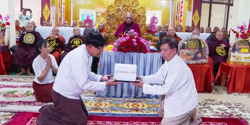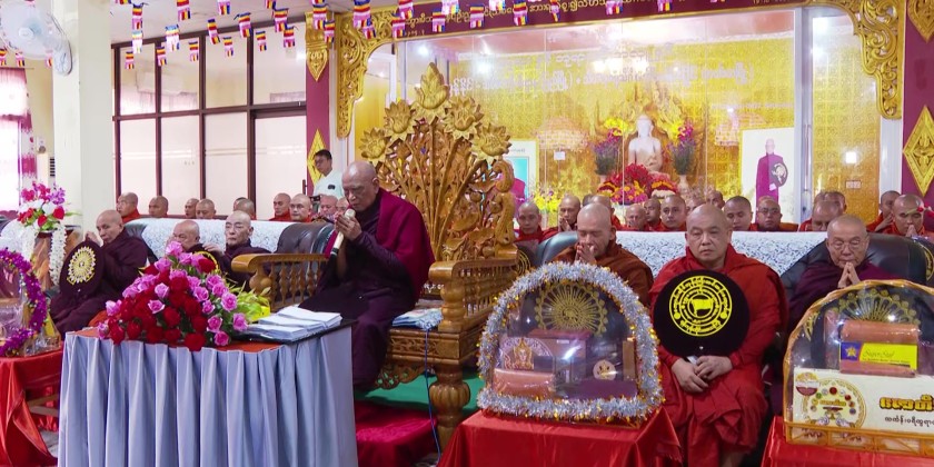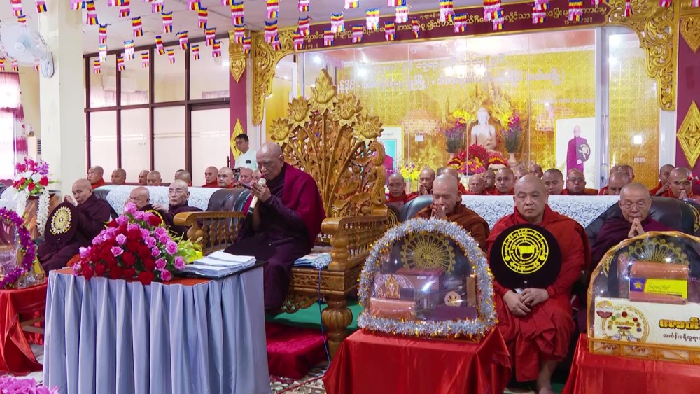 First, the congregation observed five precepts administered by the Chairman Sayadaw of the State Sangha Mahanayaka Committee Presiding Sayadaw of Thanlyin Min Kyaung Pahtamabyan Sarthintaik, Dr. Baddanta Candimabhivamsa and the Principal Sayadaw of Training Center Baddanta Vasettha clarified regarding the training.
