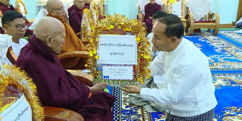 Presenting religious exam certificate: Sagaing Region CM offered offertories to the Sangha