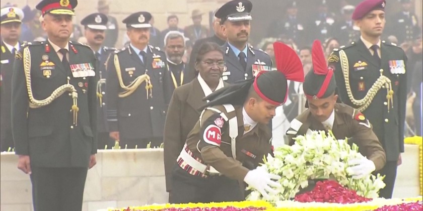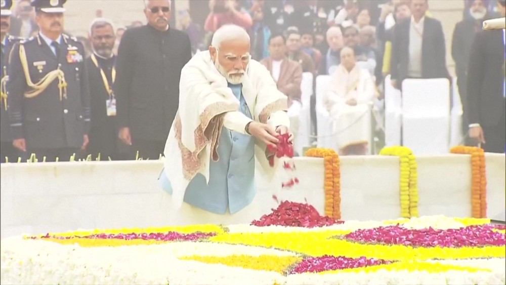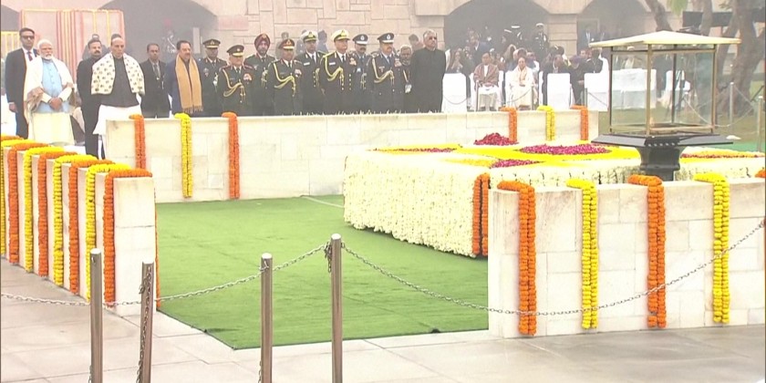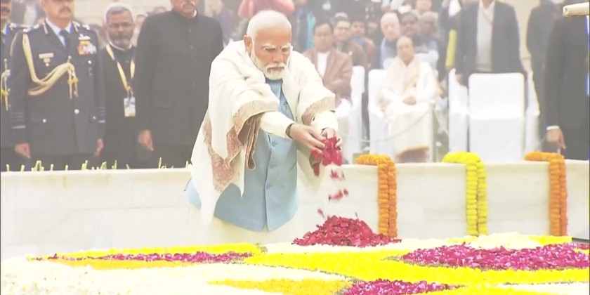 Indian Prime Minister Narendra Modi and Indian President Droupadi Murmu paid floral tributes to the father of the nation Mahatma Gandhi on his 76th death anniversary on Tuesday in Delhi. A two-minute silence was also observed followed by a gun salute. Gandhi was assassinated by Nathuram Godse at Gandhi Smriti on 30th January 1948.
