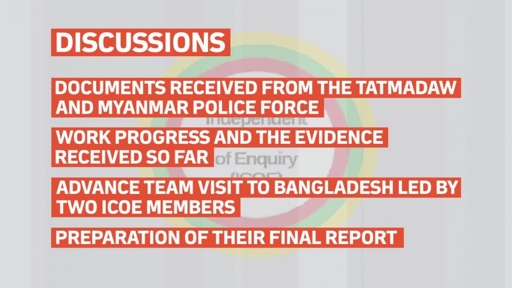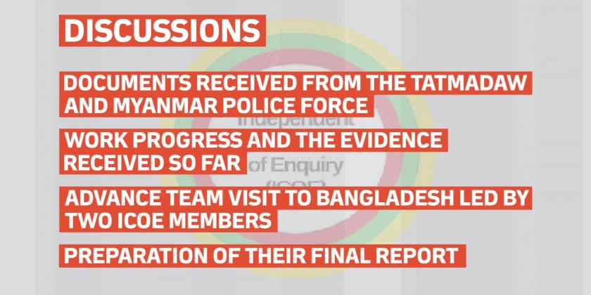 During the meeting, the ICOE discussed on the documents received from the Tatmadaw and Myanmar Police Force related to ICOE’s enquiries. They had intensive discussions on the work progress and the evidence received so far.