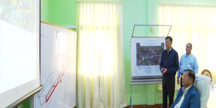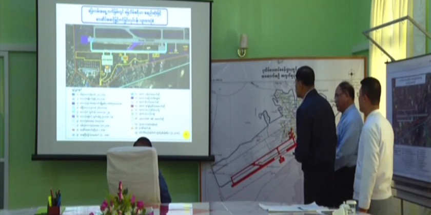 At the Pathein Airport lounge, Union Minister for Transport and Communications General Mya Tun Oo, Chief Minister U Tin Maung Win and officials presented reports on airport's history and plans for enhancement.