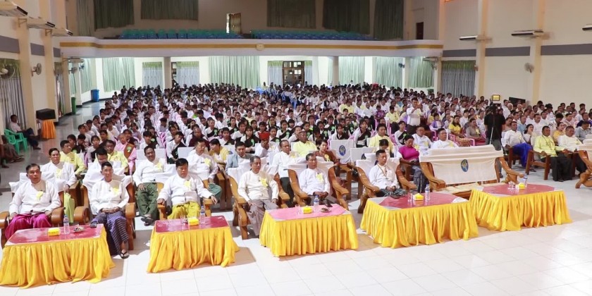 The ceremony of awarding prizes of passing the examinations of 38 blessings and the Great Chronical of Buddhas organized by the Mon State Young Men Buddhist Association (YMBA) was held at the State hall in Mawlamyaing Township in the afternoon on 12 th of May and was attended by the Mon State Chief Minister U Aung Kyi Thein, State Ministers, departmental officials, responsible persons from Mon State YMBA, training instructors and the trainees and invited guests.