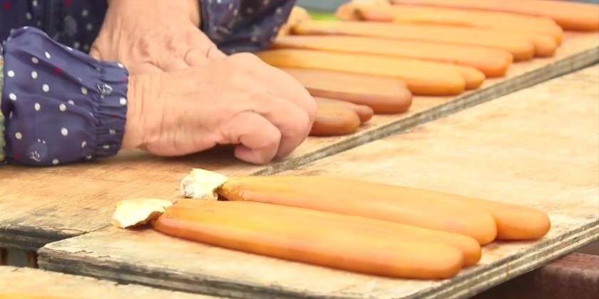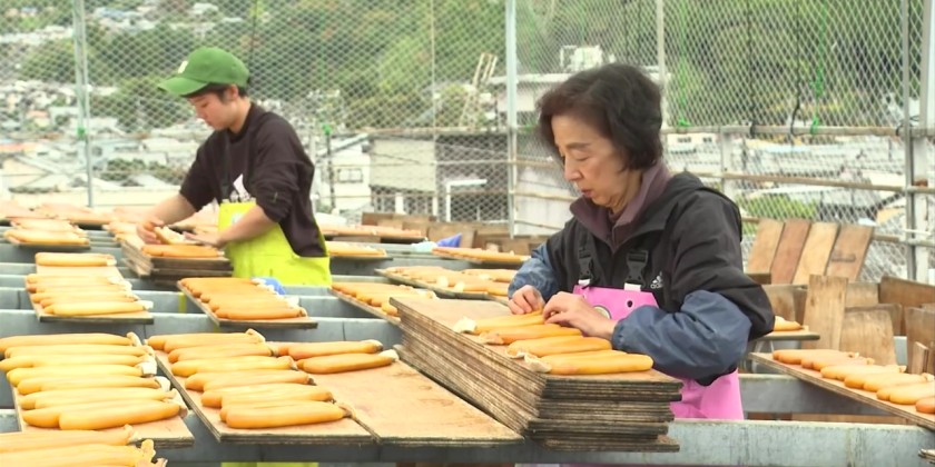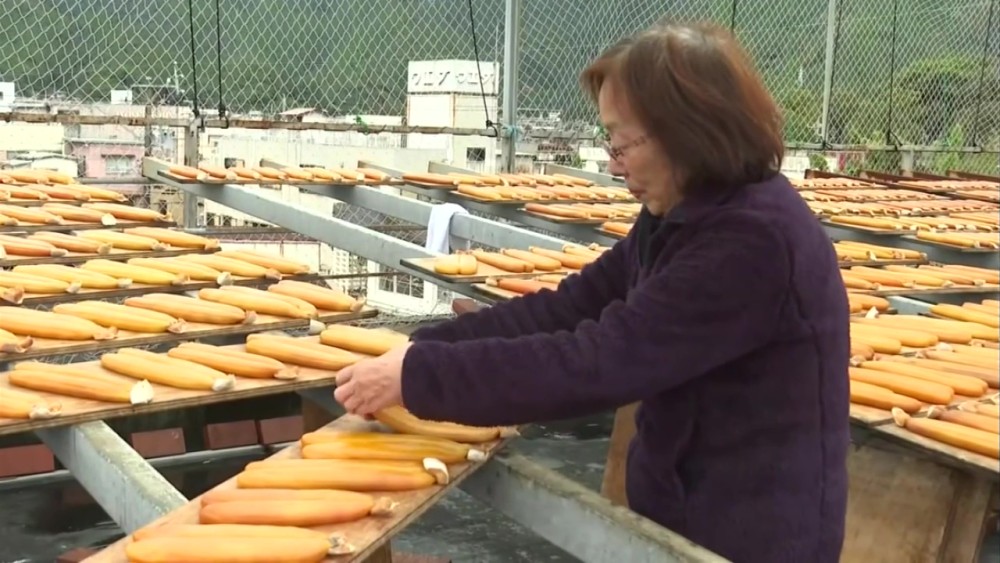 Employees were seen flipping them one by one while adjusting their shapes.This task is carried out every two or three hours on sunny days over a one-month period until the karasumi turn an amber color.The fish shop plans to sell the karasumi at its store and also ship it to traditional Japanese restaurants and customers as year-end gifts.