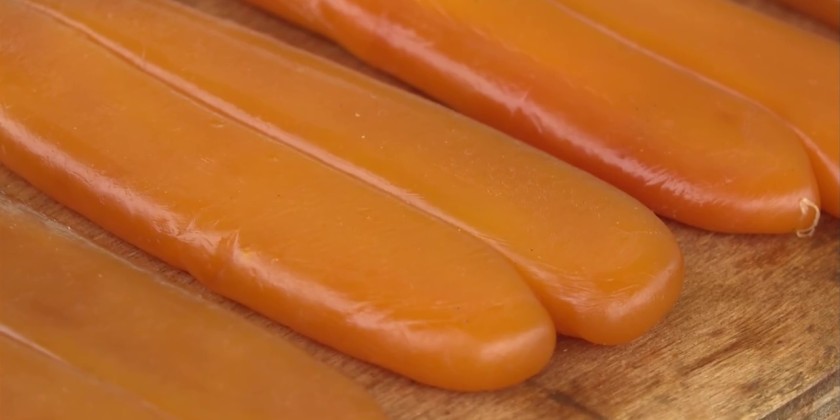 Production of “karasumi,” or dried mullet roe, is in full swing in the central Japanese prefecture of Mie. Karasumi is a highly coveted delicacy in Japan. The roe sacs of the fish are first salted, then dried in the sun. At a long-established fish shop in Owase City, around 600 pieces of karasumi were laid out on wooden boards on the rooftop.