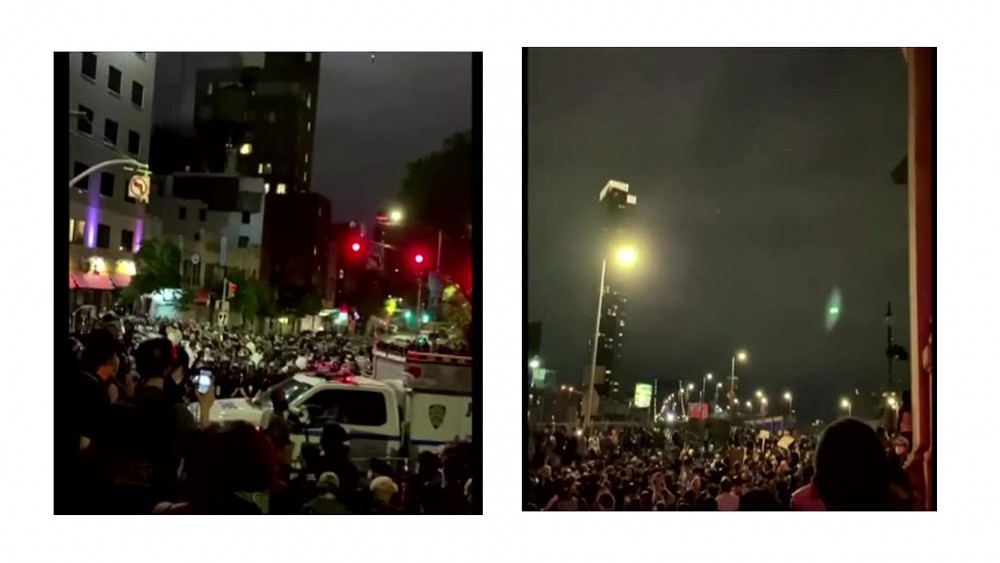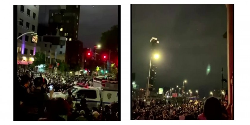 Thousands of protesters, ignoring an 8 PM curfew, occupied New York City's Manhattan Bridge on Tuesday evening, halting traffic. Eyewitness video showed protesters crowding on the iconic bridge, surrounding a police truck.
