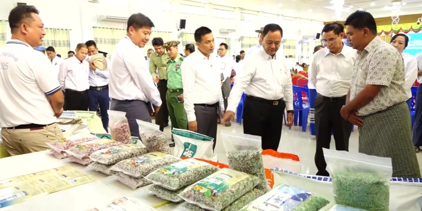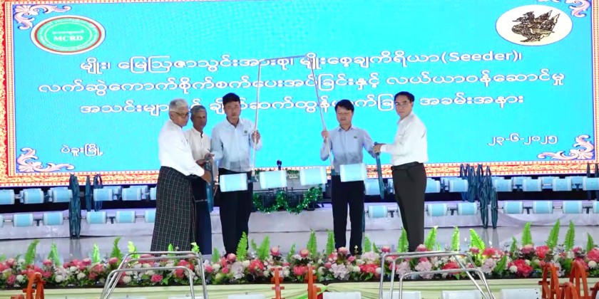 The event was jointly organized by the Department of Cooperatives, seed production companies, input supply companies, and agricultural machinery sales companies. Union Minister for Cooperatives and Rural Development U Hla Moe, Bago Region Chief Minister U Myo Swe Win, region ministers, permanent secretaries, directors-general, and officials attended the ceremony.