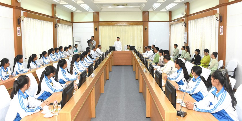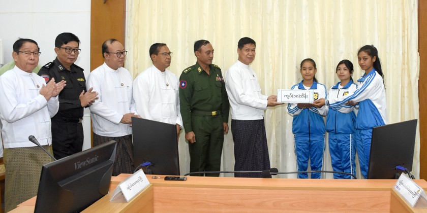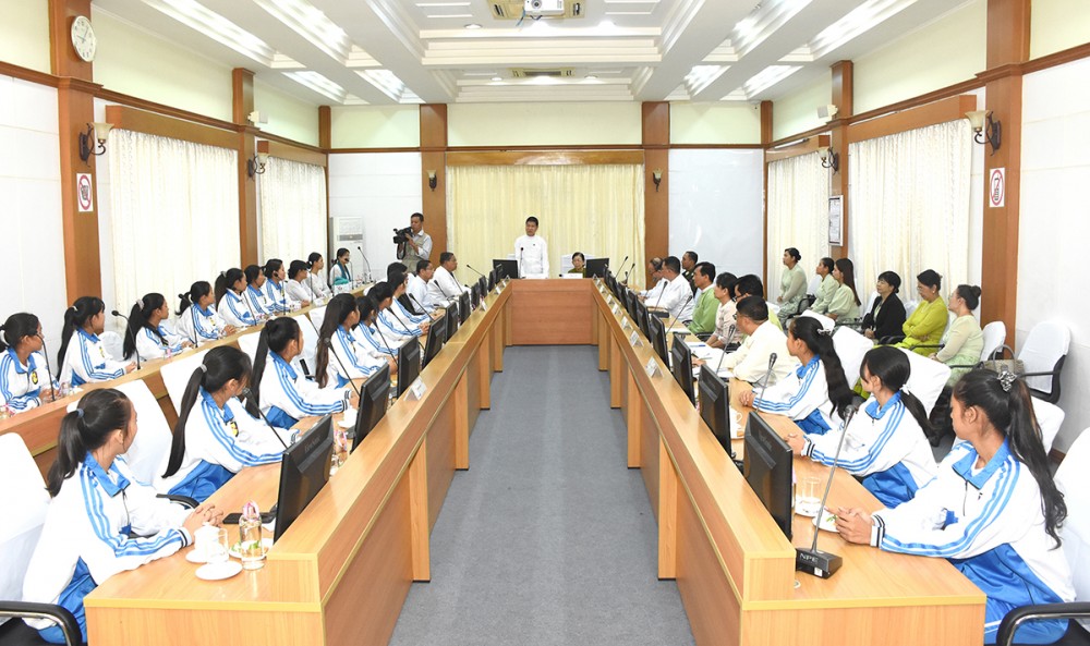 Mandalay Region Chief Minister U Myo Aung, Region Ministers and officials attended the occasion of encouraging the coaches and athletes who will participate in the 2023 Inter- Regions and States Aerobic competition representing Mandalay Region and providing cash assistance at the meeting hall of two-story building of Region Government in the morning on Sunday.