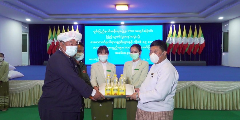 Then, Chief Minister Dr. Kyaw Tun provided rice and cooking oil to the PNO transformed Pyithusit-militia unit (Local) and responsible person of PNO accepted. The Commander of East Command Brigadier General Ni Lin Aung presented dried fishes and COVID-19 preventive medical equipments including 3000 masks and 50 of 10 litter containers of hand sanitizer and U Khun Myint Aung from PNO extended words of thanks.