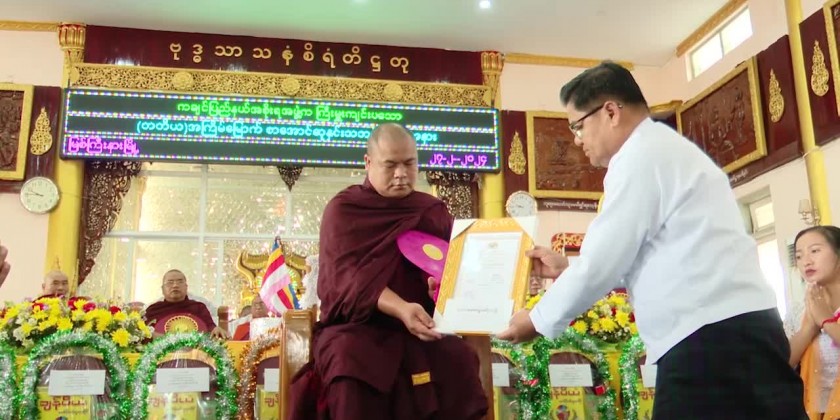 Next, the Chief Minister and party attended the third awarding ceremony for the members of Sangha who passed the 2023 Dhamacariya and Pali Pahtamabyan  examination held at Thathana Beikman in MinYat Ward at 9 AM on 27th February.