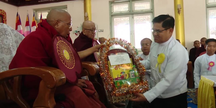 After taking sermon from the member of State Sangha Mahanayaka Sayadaw, sharing merits gained and offered day meal to the members of Sangha from Wuntho monastery and those who passed the examination.