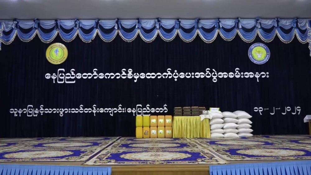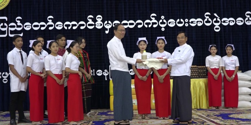 Union Minister for Health Professor Dr. Thet Khaing Win attended the ceremony of providing foodstuff and cash assistance to the trainees and Chin ethnic people from Nay Pyi Taw Nursing and Midwifery Training School by Nay Pyi Taw Council held in Nursing Training School on Tuesday.