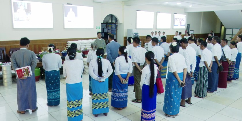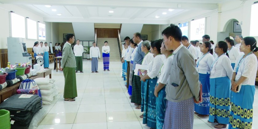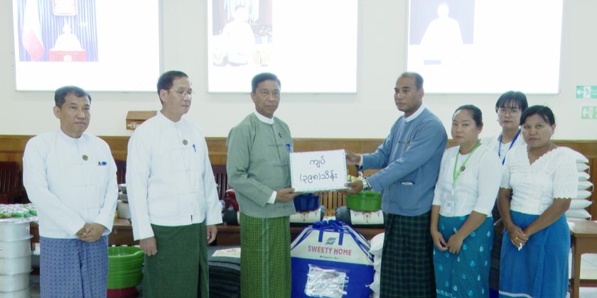 Union Minister Dr. Soe Win, together with donors, contributed a total of 32.3 million kyats, 17 types of household items, and the foldable mosquito nets. Additionally, for 15 children of staff members who will be retaking the matriculation exam, 500,000 kyats each was provided in support. In total, the Union Minister donated 39.8 million kyats along with 17 types of relief items to staff members from the ministry office and three departments.