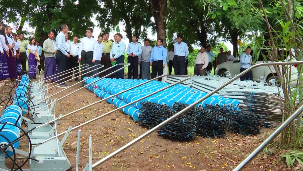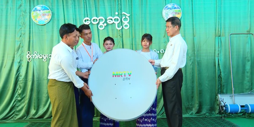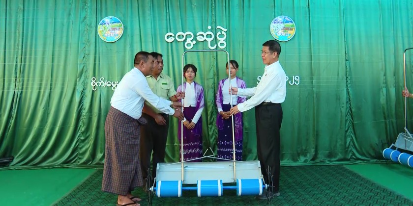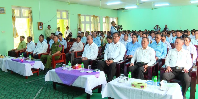 Afterward, the Chief Minister, Region Ministers and officials presented drum seeders and sacks of sunn hemp to farmers from Patheingyi and Madaya townships. They also presented an MRTV DTH, an MRTV DVB T-2 Set Top Box, a 50-inch Smart TV, and sports equipment to the principal and students of the institute. One of the farmers then presented words of thanks.