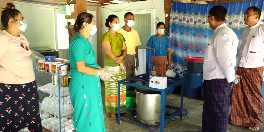 Continuing their trip, the Union Minister and officials inspected the multi-purpose liquid soap production in Kyaugye Model Village, visited the multi-purpose farm owned by the cooperative association in Pyinmana Township where member farmers were cultivating high-yielding varieties of paddy, and observed the breeding of Brahman cattle and local cattle farming.
