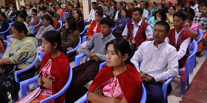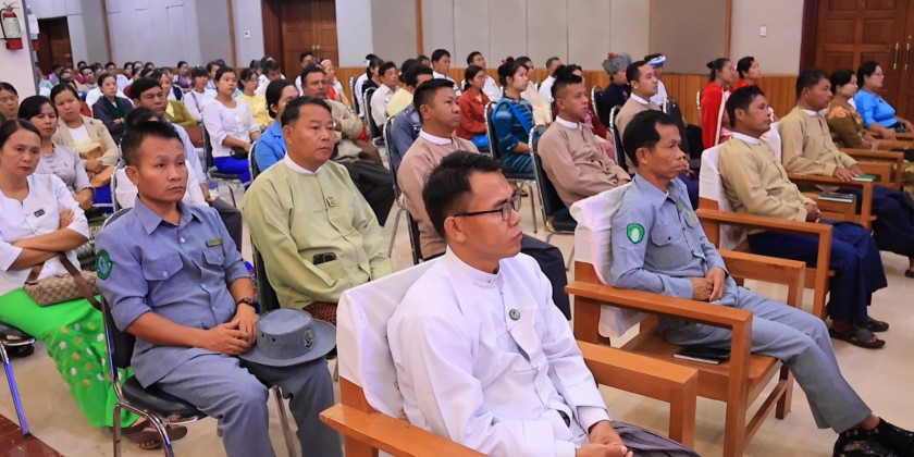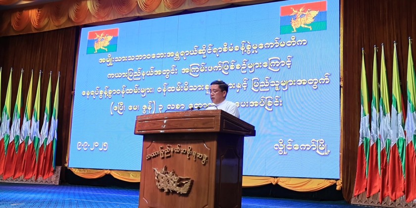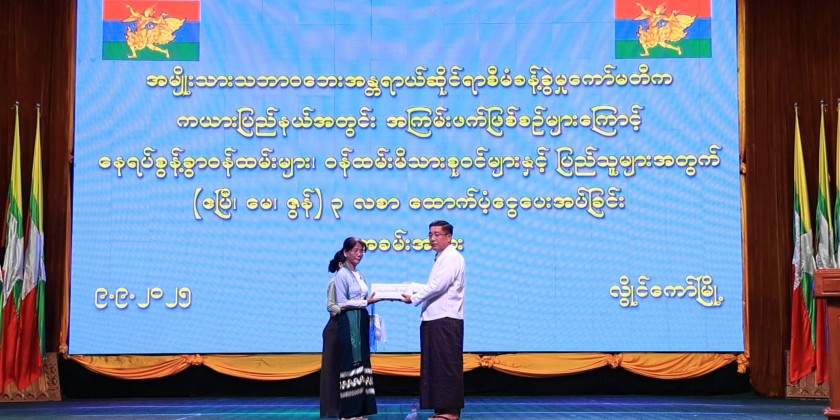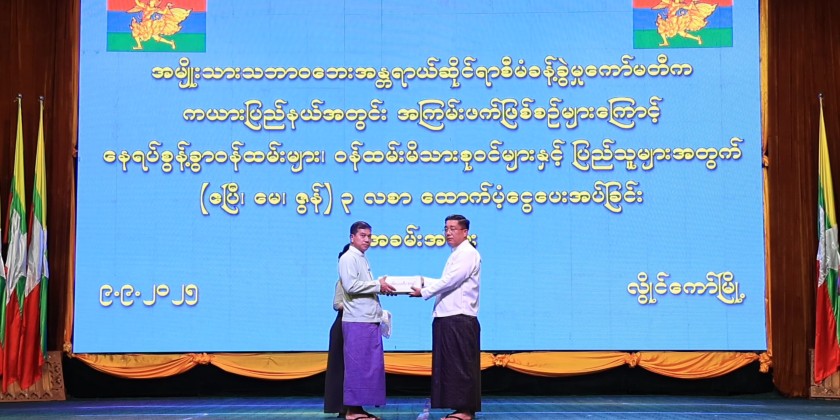 Kayah State Chief Minister U Zaw Myo Tin attended a ceremony to provide financial aid to displaced staff at the State Hall in Loikaw Township on Tuesday, together with other concerned officials, staff and their families and locals.
