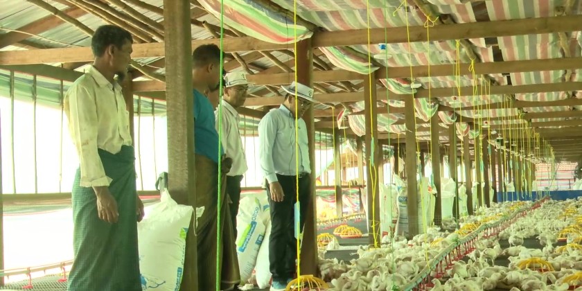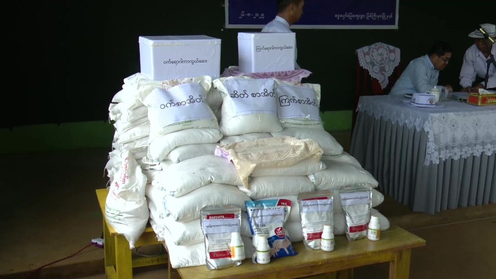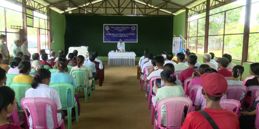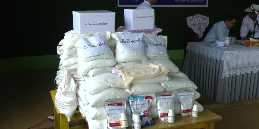 Kachin State Chief Minister U Khet Htain Nan and officials attended a ceremony at the village hall in Ngwe Pyaw Model Village, Myitkyina Township on August 26, for the donation of livestock to local displaced people who have been resettled in the village to help them enhance their livelihoods through farming.