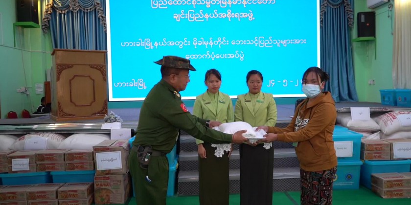 Next, the Lt. Gen. Min Naing, Chief Minister Dr.Wong Hsun Htan, Deputy Commander of North-West Command, chief justice of state high court, state ministers, state advocate general provided rice, cooking oil, salt, chick pea, eggs, dried noodle and corrugate iron sheets to the cyclone hit-victims and one local residents extended words of thanks on behalf of all cyclone hit families.