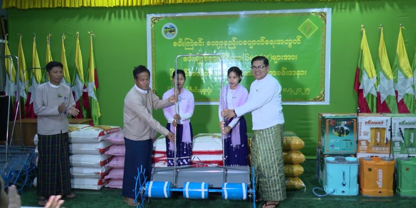 A ceremony for the distribution of rice seeders to farmers in various townships of Kachin State to promote proper rice cultivation methods, reduce the traditional broadcast seeding method, improve paddy yield targets, and increase farmers' income across the State, was held at the meeting hall of the State Department of Agriculture in the morning on July 8.