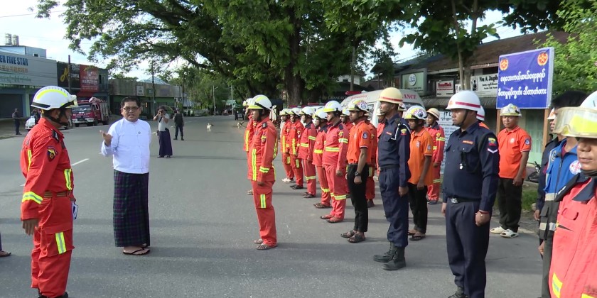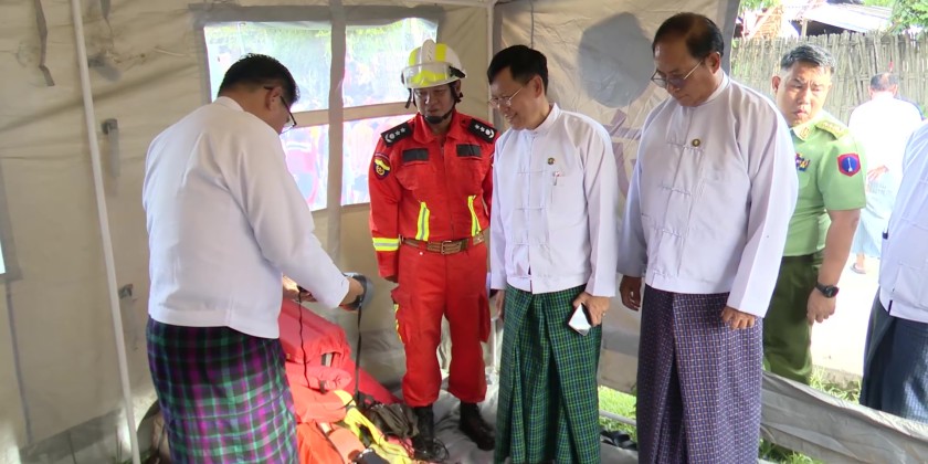 Later, the Chief Minister and officials inspected rescue preparedness activities, as there have been frequent rainfalls in upper Ayeyarwady River areas and across the state this July. They checked the deployment of rescue teams prepared for emergency response in case the river level rises again. The Chief Minister also distributed meal boxes to the rescue team members.