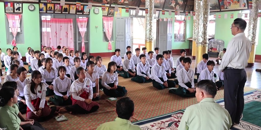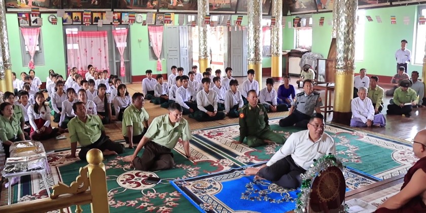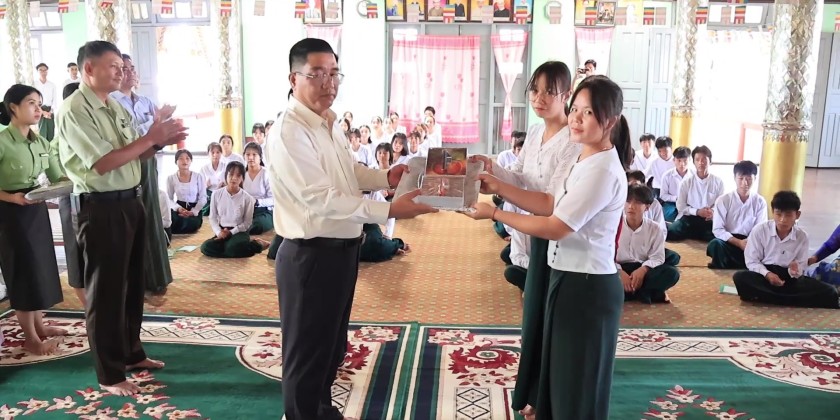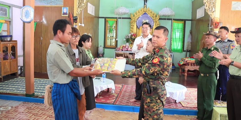 In the afternoon, the Chief Minister and officials arrived at the Shwe Kyaung Pariyatti Sarthintaik monastery in Shan Su Ward, Loikaw Township. They paid respects to the Presiding Sayadaw, offering donations and cash for renovations. They then cordially met with and encouraged students from Pekhon Township who were temporarily displaced and are now studying at Basic Education High School No (1) in Loikaw. It is reported that rice, oil, dried fish, stationery, and school uniforms were provided to the students and teachers to ensure their comfortable living and studying conditions.