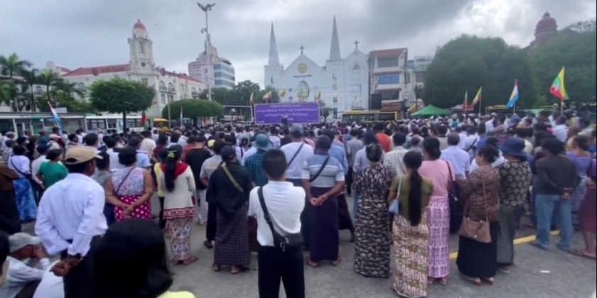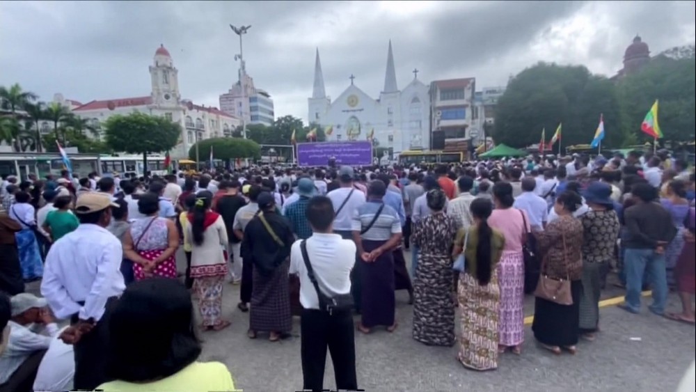 The expressing of strong public condemnation of the inhumane terror acts of MNDAA terrorist insurgent group which launched attacks on the Tatmadaw hospital in Lashio Township, Shan State (North), resulted in mass murder of innocent people including doctors and nurses from the hospital and women and children who were seeking medical treatment at the hospital and forced abduction of some patients, was conducted in front of City Hall, Thapyaykone Ward, Zabuthiri Township of Nay Pyi Taw Council Are and at the Bandula Monument Parking Lot in front of City Hall, Kyauktada Township of Yangon Region on 6th August.